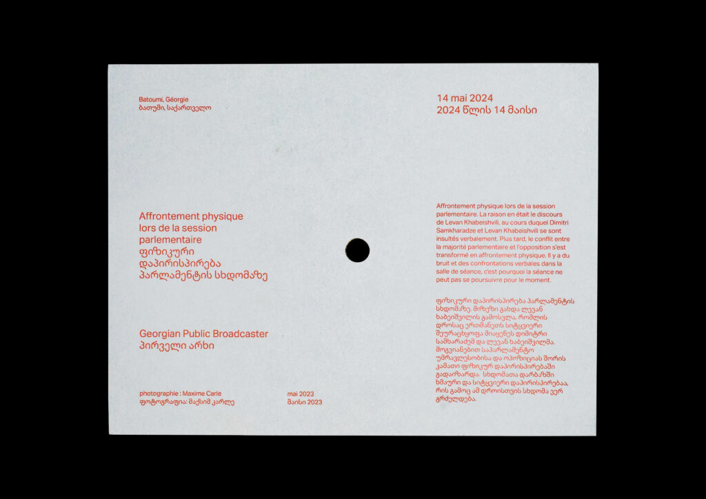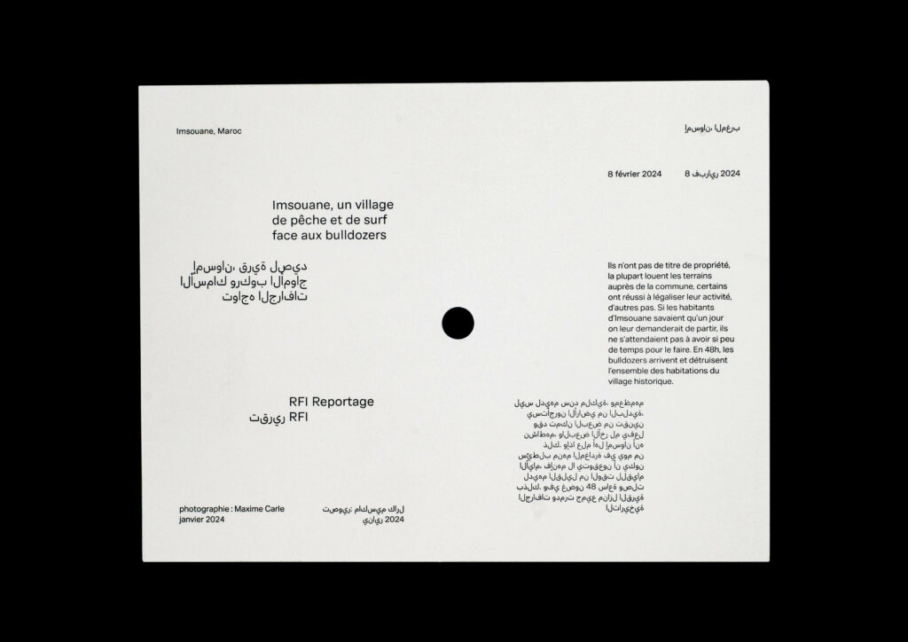 This work explores the use of sound to either enhance or contrast with visuals—transcribed by grooves engraved on cards that can be played on a turntable— offering new ways to interpret images. The first series centers on Georgia, where protests erupted against a pro-Russian law. I used recordings of parliamentary disputes, overlaid on fragmented footage of residential areas filmed in 2023 with an old phone—symbolizing societal division and a regression from democratic hopes. The second series, set in Imsouane, Morocco, captures a peaceful surf town in early 2024. However, this harmony is disrupted by testimonies recorded days later, following the sudden demolition of homes and businesses for a state-led coastal redevelopment tied to the 2030 World Cup.